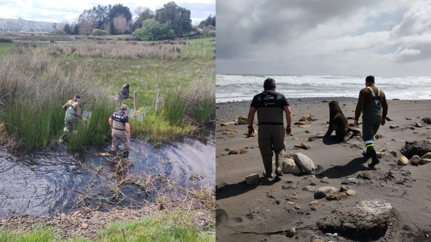 Lobo marino es rescatado y devuelto al mar luego de adentrarse a un campo en Puerto Saavedra